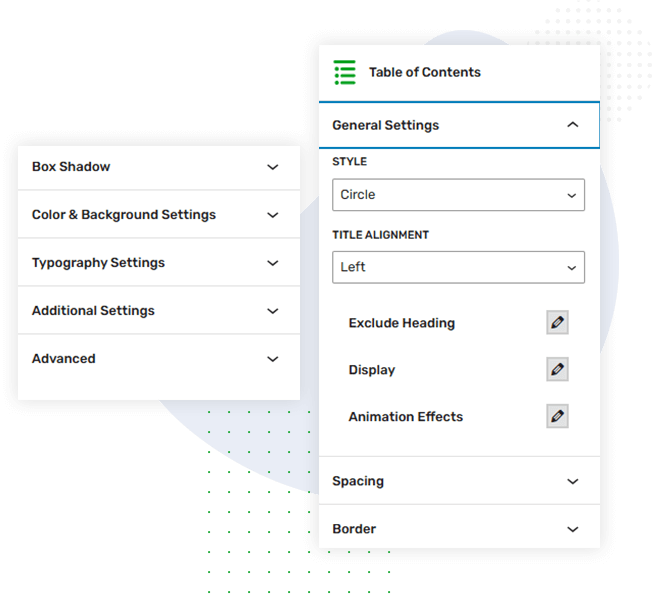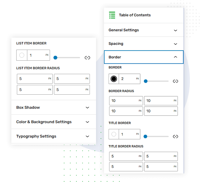 Enhance your TOC design with border and border-radius settings. Add clean outlines or soft rounded edges to create a polished look. These controls help your Table of Contents stand out while maintaining a refined, professional appearance.