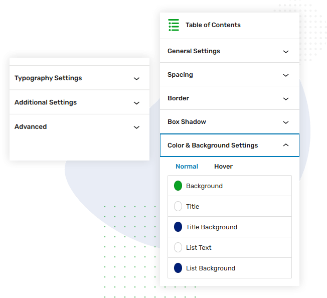 Personalize your TOC style with customizable title, list color, and background color settings. These options let you match your site’s design, highlight important elements, and create a visually appealing, easy-to-read navigation section.