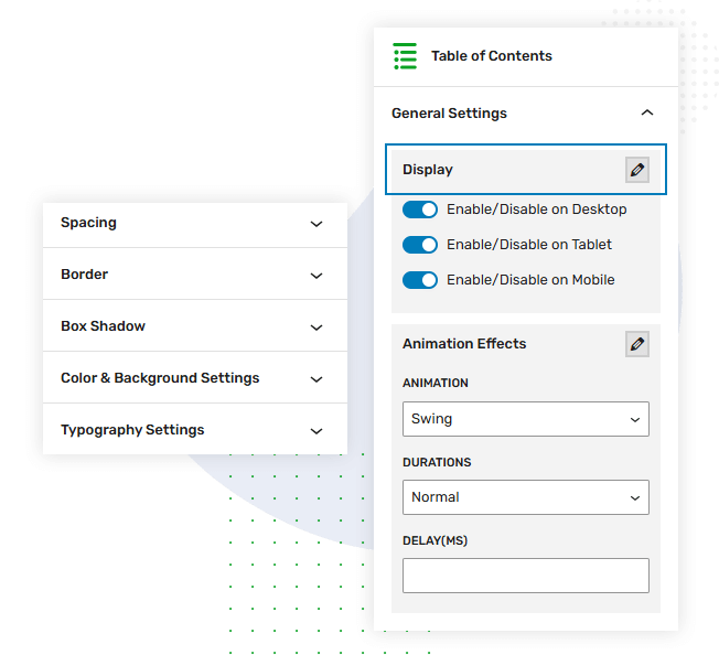 Manage TOC display settings with device-specific visibility controls. Show or hide the Table of Contents on desktop, tablet, or mobile. Add smooth animations to create an engaging, dynamic navigation experience that enhances user interaction.