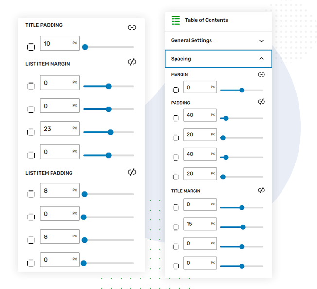Adjust spacing settings to refine your TOC layout. Customize margins and padding for both headings and content, ensuring balanced spacing, improved readability, and a clean, well-structured appearance that aligns perfectly with your page design.