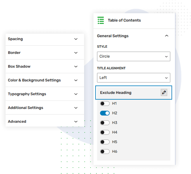 Customize your Table of Contents with flexible heading marker styles. Choose circles, numbers, or alphabets to match your design. This setting enhances readability and gives your TOC a clean, organized, and visually appealing structure.